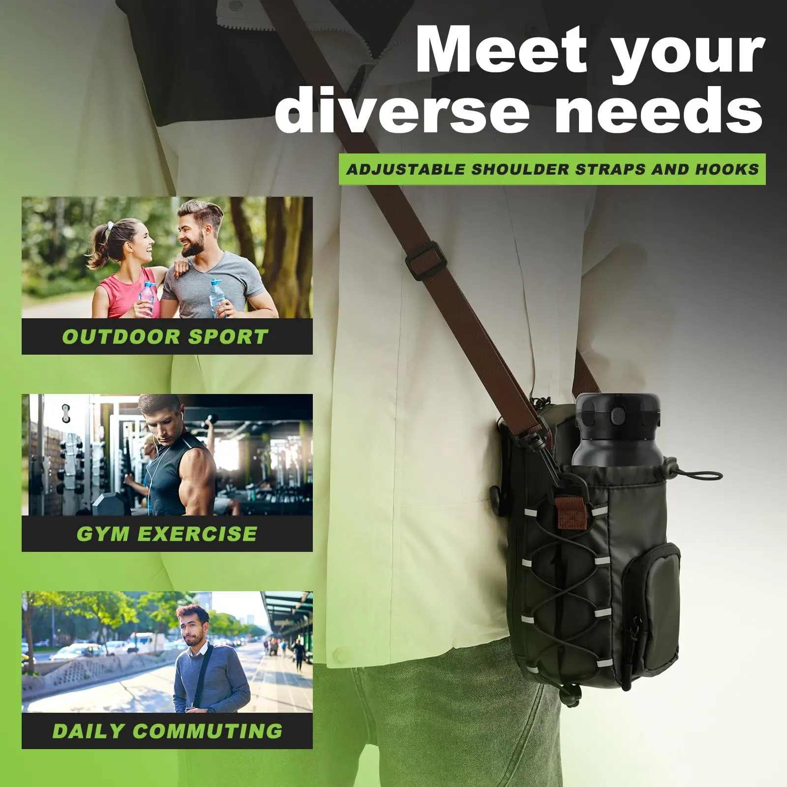 | Magnetic Gym Chest Pouch with Water Bottle Holder Gym Crossbody Bag Gym Bottle Carrier Bag for Men Women Gym Accessories Organizer Features: 1.Magnetic Design: The gym bag can be securely attached to any metal surface, keeping your belongings off the gym floor. This gym sling bag uses a magnetic attachment for added convenience and safety. 2.Spacious Compartments: Equipped with multiple compartments and side pockets, the gym sling bag offers ample space to organize your phone, earbuds, sunglasses, keys, wallet, and more, ensuring everything is easy to find. 3.Easy to Carry: With a handle, adjustable shoulder strap, and hook, the gym crossbody bag is for gym workouts, weekend trips, daily commutes, and outdoor activities. 4.Bottle Compatibility: Designed to fit most standard water bottles from 18 oz to 40 oz, the gym bottle carrier bag is compact yet spacious enough to hold all your gear, crafted from premium materials. 5.Essential Gift: The gym chest pouch is a gym essential, easily magnetically latch onto gym equipment. It's also an excellent Christmas gift for men, women, adults, and teens. Specification: Origin: Mainland China Product size: 198.1x88.9mm 7.8x3.5inch Material: cloth Note: Due to different monitor settings and lighting conditions, the actual color of the item may vary slightly from the pictures. Thanks for your understanding! Please allow a 1-2 cm difference in measurements due to manual measuring. 1 x Gym Bag |